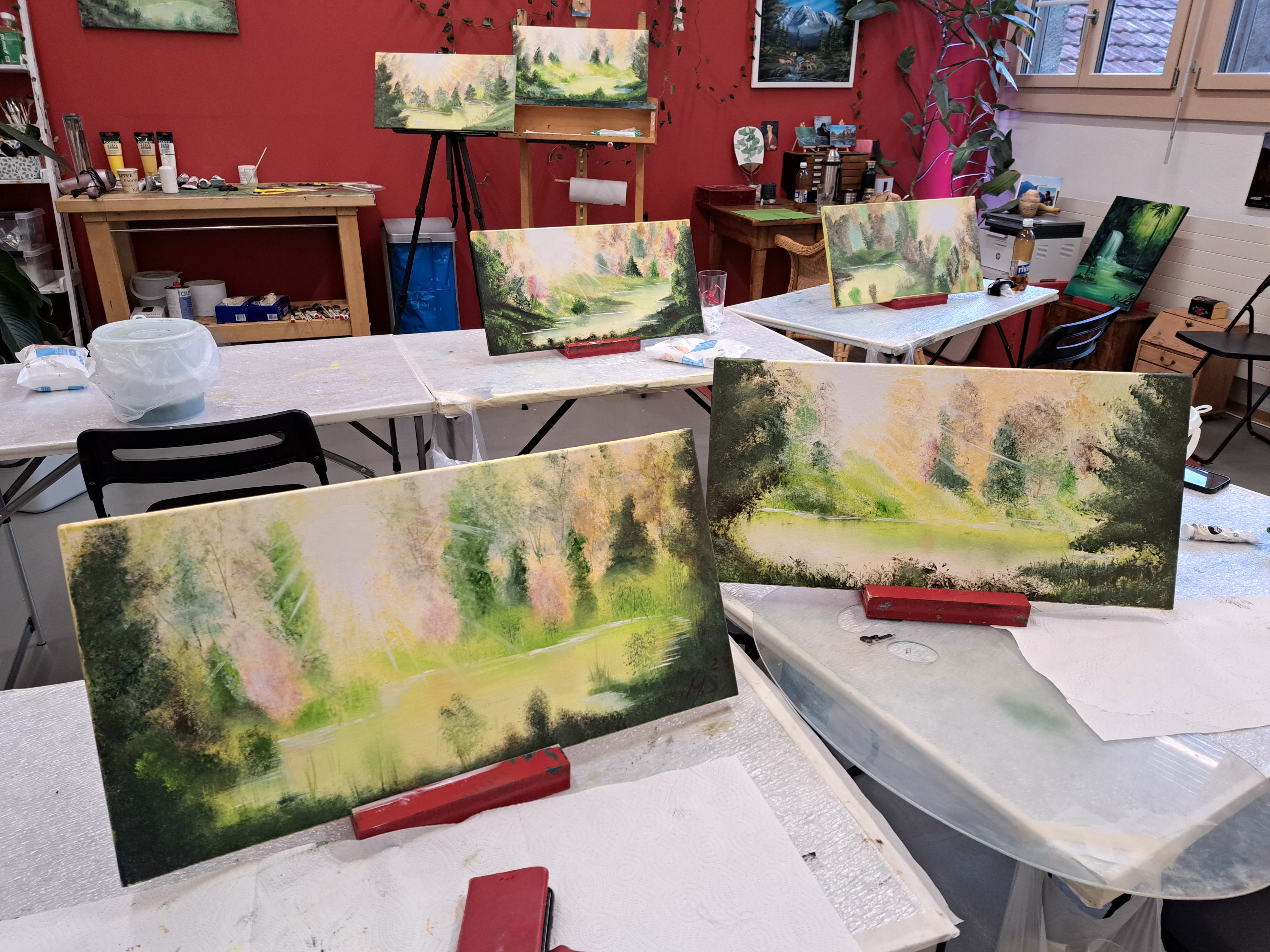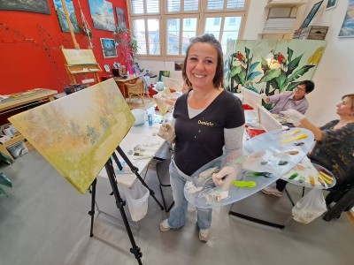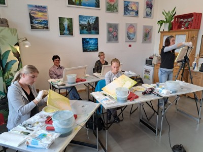 Dieses Ölbild wird praktisch ausschliesslich mit Tüchern gemalt, wir verwenden nur gelegentlich einen Pinsel. Es ist eine Eigenkreation von Anja und wird auf Wunsch der Teilnehmer gelehrt. Das originale Bild ist ein Grossformat und wird in diesem Kurs in einer kleineren Form vermittelt. Sobald Ihr die Technik könnt steht euch nichts mehr im Weg Zuhause eine grosse Leinwand selbst zu bemalen. Der Kurs ist bereits ausgebucht, bei Interesse mache ich gerne ein zweites Datum mit euch ab, meldet euch einfach bei mir.