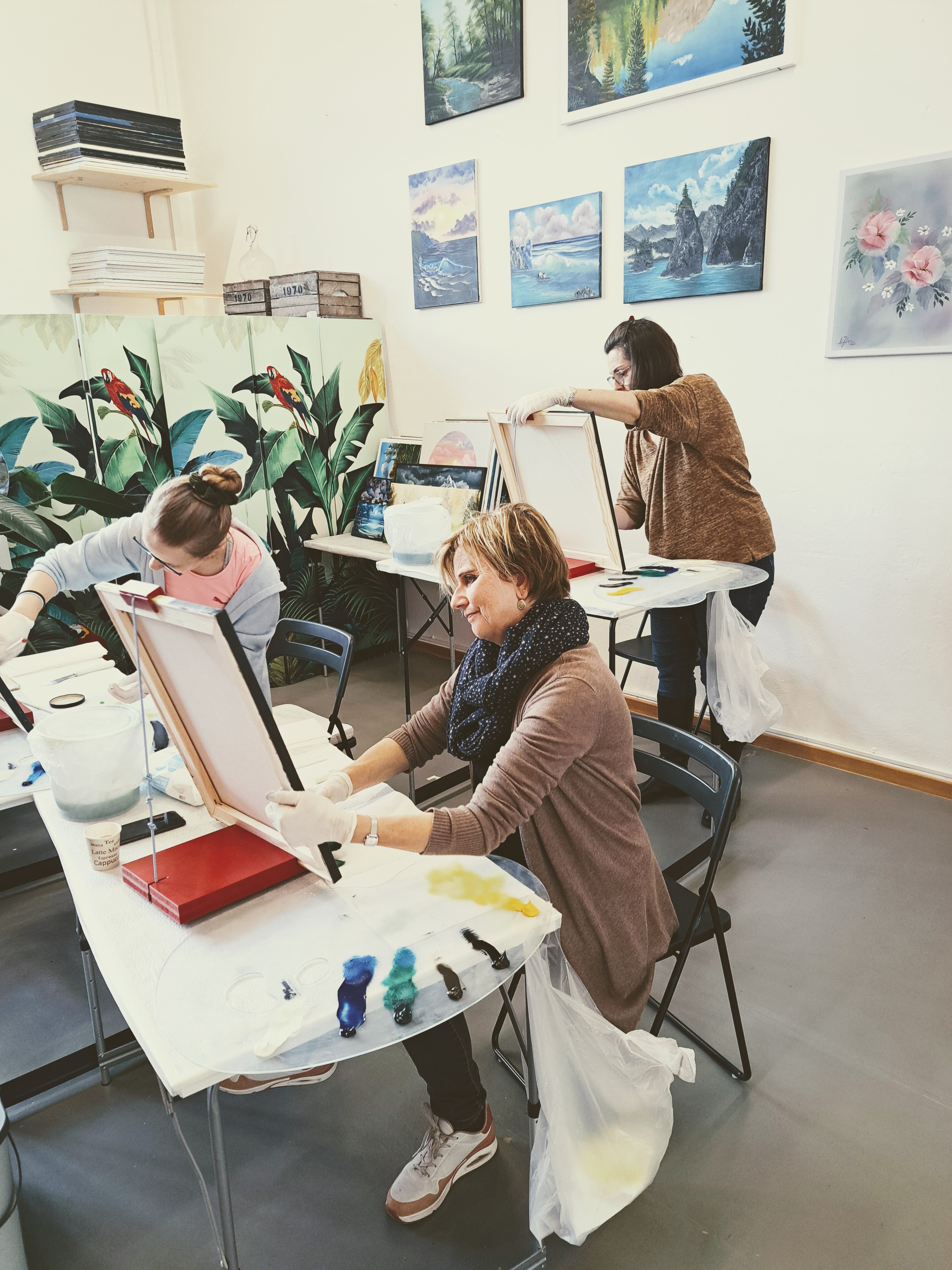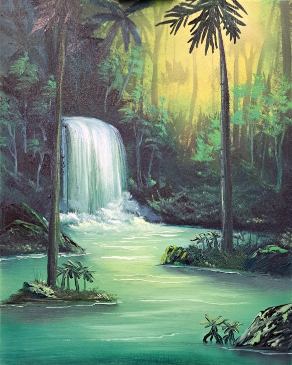 Male mit mir diese exotische Regenwaldszene: Ein rauschender Wasserfall ergiesst sich in einen Teich, das Licht bricht durch die Palmen und erleuchtet die Szenerie. Kleine Mangrovenbäume saugen das Wasser auf, man kann die Luftfeuchtigkeit geradezu spüren. Die Grillen zirpen und das Wasser rauscht.. Wenn auch du dem Wintergrau entfliehen willst dann male mit mir diese berauschende Szene. Es sind keine Vorkenntnisse notwendig, ich freue mich auf dich!