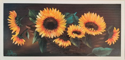 Male mit mir diesen strahlenden Korb voll Sonnenblumen! Der dunkle Hintergrund steht im starken Kontrast zu den fröhlich gelben, strahlenden Sonnenblumen. Bei genauerer Betrachtung siehst du sogar die Pollenstempel in der dunklen Mitte der Blumen. Grüne Blätter umrahmen und füllen die Szenerie.
