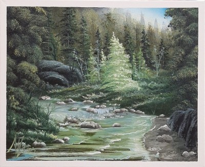 Dieses Bild entführt uns an einen ruhigen See der im Mondlicht badet. Mitten im nächtlichen Wald, eingerahmt von Felsen und Büschen schimmert der Mond im Wasser. Eine Szene wie aus einem Märchenbuch.