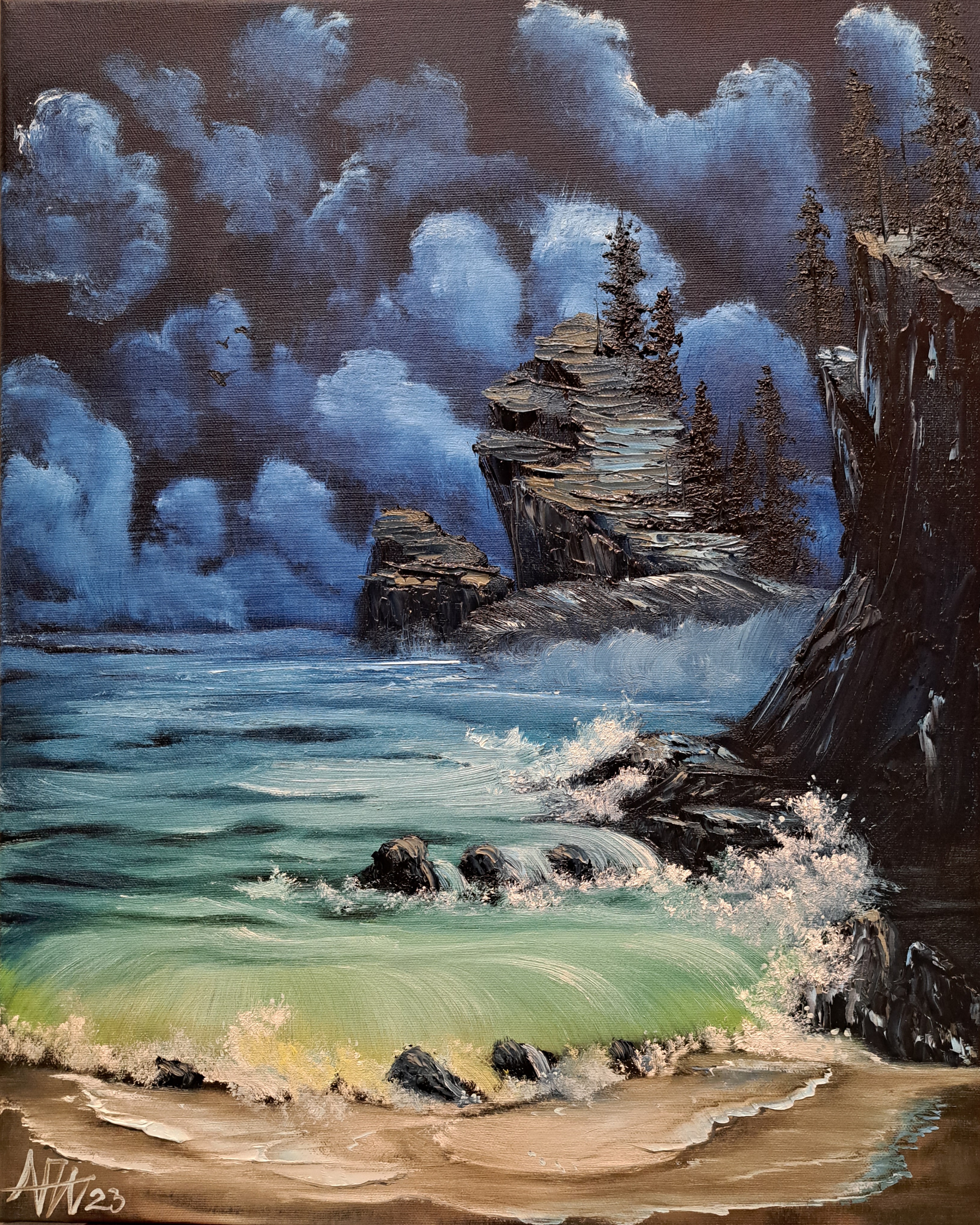Am Mondhell erleuchteten Nachthimmel türmen sich die Wolken. Naht ein Strum? Das anschwellende Meer rauscht in die sandige Bucht und überspült die Steine und Felsen. im Hintergrund stehen einsame Felsnadeln auf welchen sich einige Bäume festkrallen und den stürmischen Winden des Meeres trotzen.